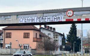 Na bijelom platnu, razvijenom duž ograde pasarele, ispisana je poruka „Srećan rođendan“, dok je na drugom transparentu istaknuta poruka: „Jedan je branio Srpsku u ratu, a drugi je brani u miru“.