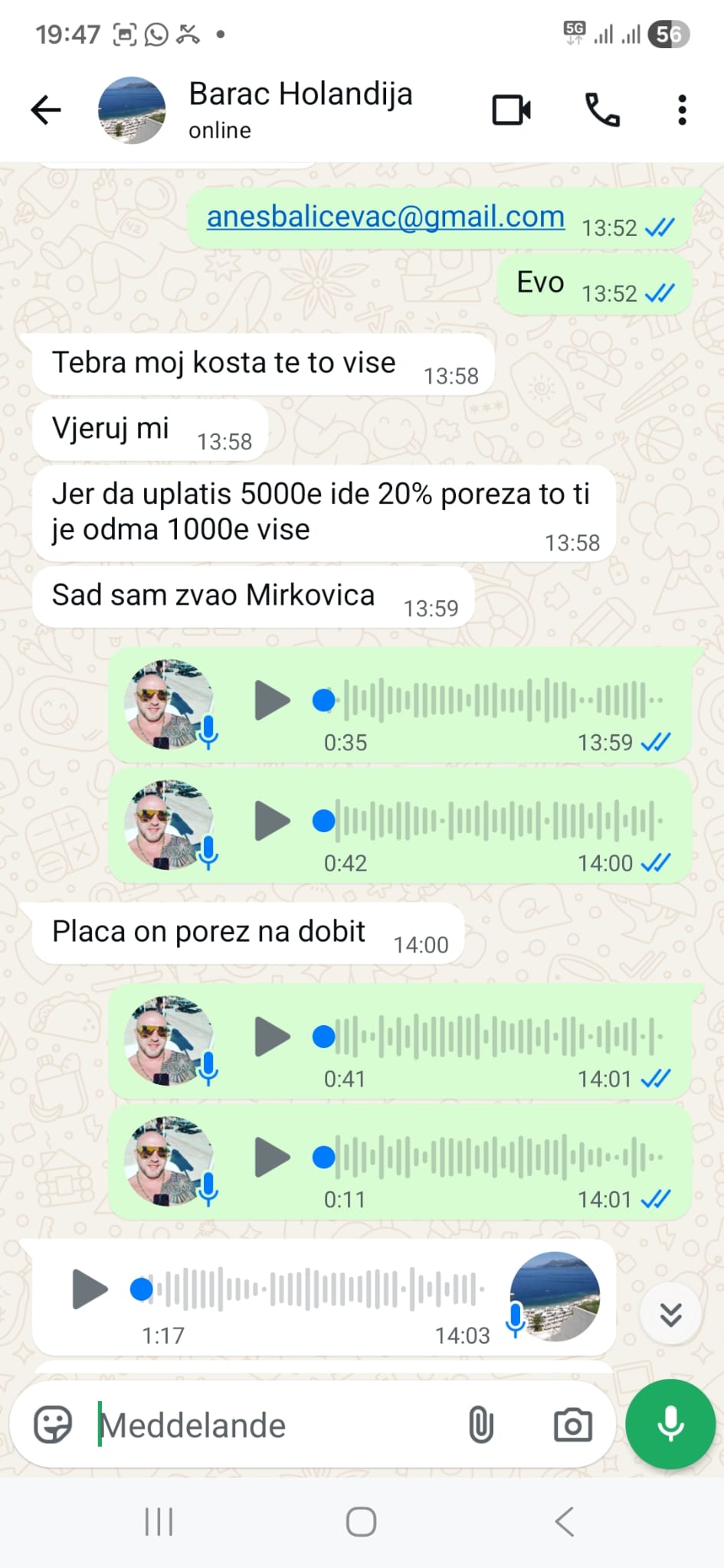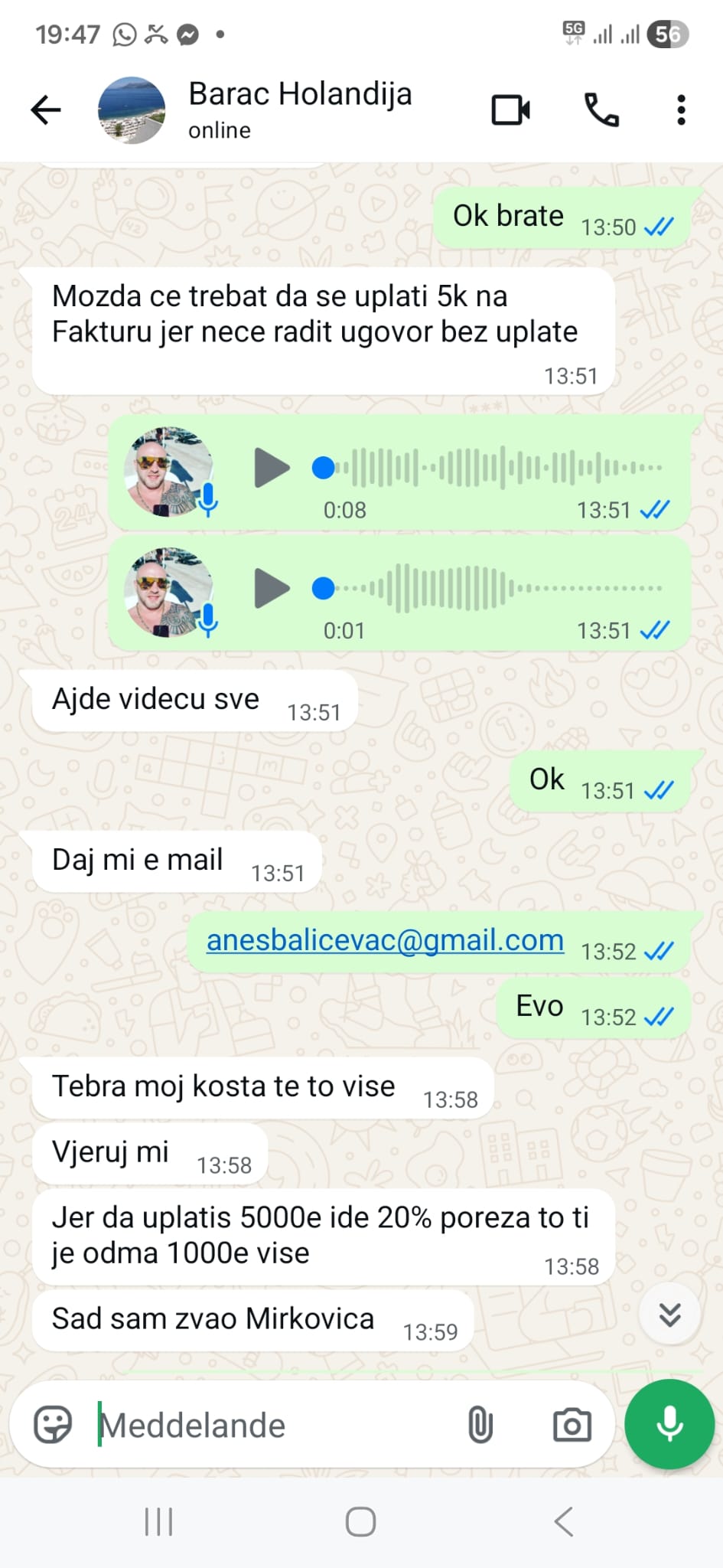 U prepiskama koje su u posjedu redakcije jasno se vidi da je spor nastao onog trenutka kada je otvoreno pitanje regularnog ugovora i novca koji je trebalo prijaviti. U porukama se pominje uplata od 5.000 evra na fakturu, kao i dodatnih 20 odsto poreza, odnosno još 1.000 evra. Dalje se navodi da se ugovor neće raditi bez prethodne uplate, te da cijela stvar “košta više” kada ide regularnim putem. U istoj komunikaciji pominje se i da je o svemu obaviješten Mirković.