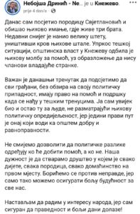 Objava Nebojše Drinića, u kojoj se predstavlja kao zaštitnik ljudi i borac protiv nepravde, dobila je potpuno drugačije značenje onog trenutka kada se pojavila krivična prijava Svjetlanovića Draška. Tada je postalo jasno da iza patetične političke poze ne stoji pomoć, već grubo korišćenje tuđe nesreće za ličnu promociju.