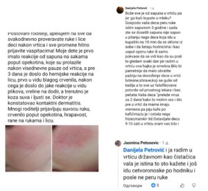 Majka je u objavi navela da je njeno dijete najprije imalo reakcije na šakama “poput opekotina”, a potom i hemijsku reakciju na licu, koja je krenula od blagog crvenila, a završila plikovima, osjećajem vreline na dodir, suvom kožom i ljuštenjem. Kako je napisala, doktor je konstatovao kontaktni dermatitis, a dodala je i da više roditelja prijavljuje suvoću ruku, crvenilo, hrapavost i rane na rukama i licu djece.