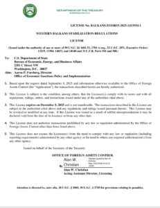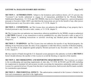 Licenca, izdata 9. septembra 2025. godine na zahtjev podnesen 8. septembra, odnosi se na regulacije iz seta propisa poznatih kao Western Balkans Stabilization Regulations (31 C.F.R. Part 588).