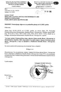 U odgovoru Kolegijuma sekretarijata Parlamentarne skupštine BiH, dostavljenom na osnovu poslaničkog pitanja, navodi se da sporne izmjene nisu bile predmet rasprave ni u Predstavničkom domu, niti u Domu naroda Parlamentarna skupština Bosne i Hercegovine.