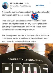 Parkerove objave razbijaju svaku iluziju. U jednoj otvoreno slavi Pride „bez granica“ širom West Midlandsa, a u drugoj javno govori o sastanku sa Birmingham LGBT savezima i planovima za novi LGBT centar. Dakle, Stanivukovića u Britaniji ne prima bilo kakav tehnički domaćin, nego političar koji se otvoreno svrstava uz Pride strukture i LGBT mreže.