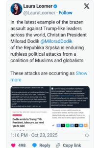 Američka novinarka i politička komentatorka, bliska Trampova saradnica, Laura Lumer objavila je na društvenoj mreži X da je predsjednik Republike Srpske Milorad Dodik meta „nemilosrdnih političkih napada“ koje, kako je navela, predvodi „koalicija muslimana i globalista“.